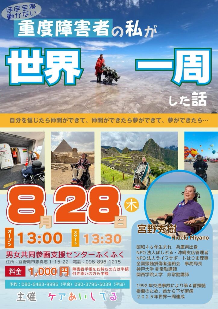 ほぼ全身が動かせない状態ですが、電動車椅子に出会ったことで人生が一変し、仲間と共に世界一周を実現された方です。