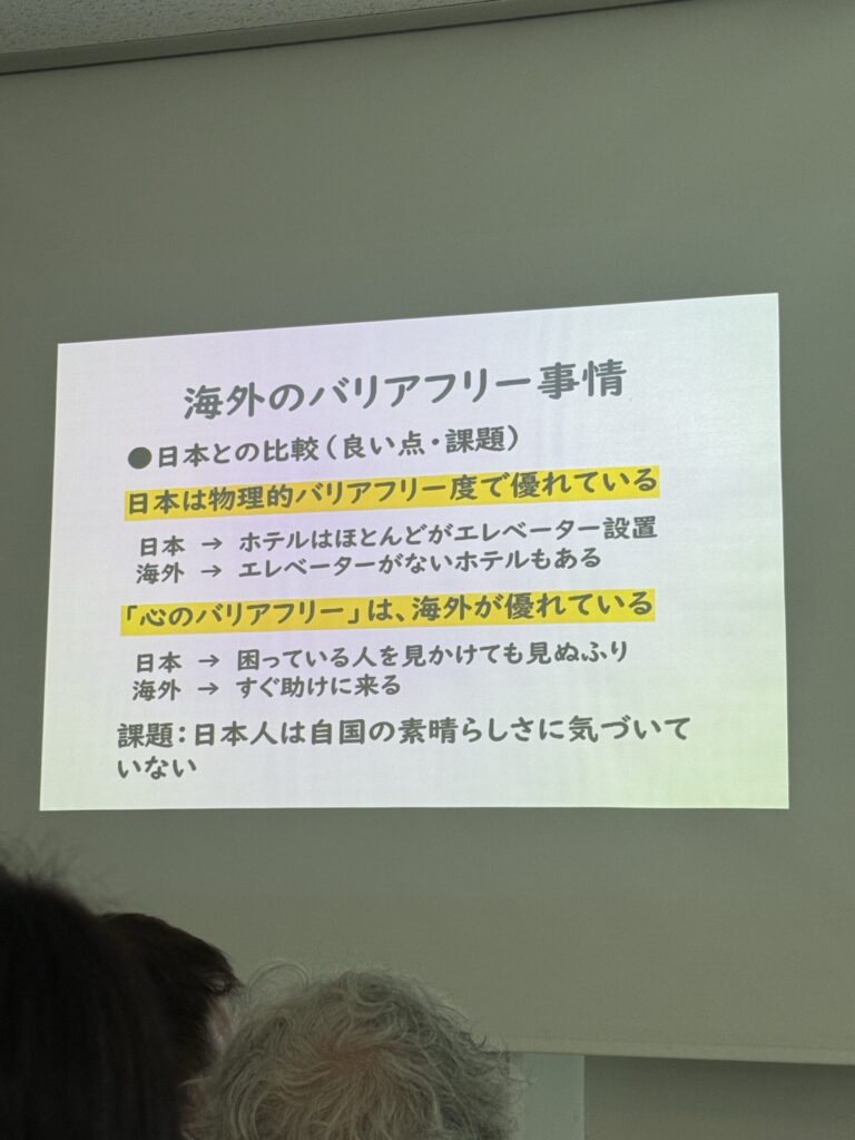 日本は物理的なバリアフリー度で優れている (ホテルにエレベーターがあるのは当たり前) 海外は心のバリアフリーが優れている (困っていたら、すぐに助けに来てくれる)
